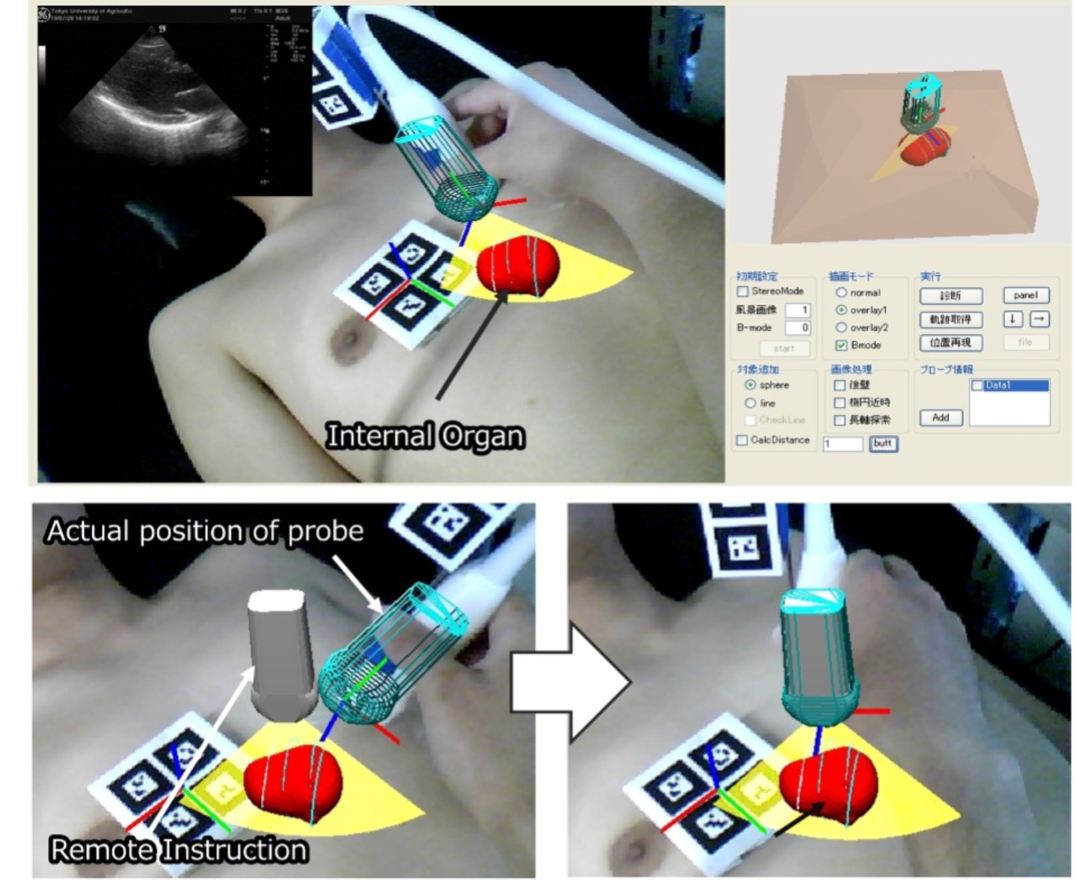 また当時はまだHMD(ヘッドマウントディスプレイ)が普及していなかったため、PCの画面にARによるガイド情報を表示していましたが、現在はこのような仕組みをHMDを用いたARに適用したり、超音波プローブの位置計測にマーカー(黒い枠の正方形の目印)を使わない「マーカーレス化」に関する研究などを継続しています。